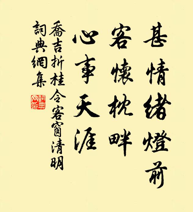 参考注释情绪(1) 情丝,缠*绵的情意 情绪留连 (2) 泛指感情 富于情绪 (3) 心情;心境 醒来时情绪极坏 (4) 情况;端绪 未知情绪 (5) 劲头 学习的情绪很好 (6) 指不正当或不愉快的情感 闹情绪 客怀身处异乡的情怀。 宋 张咏 《雨夜》诗:“帘幕萧萧竹院深,客怀孤寂伴灯吟。无端一夜空阶雨,滴破思乡万里心。” 宋 戴复古 《度淮》诗:“一雨足秋意,孤吟写客怀。” 元 萧允之 《蝶恋花》词:“已是客怀如絮乱,画楼人更回头看。” 清 叶廷琯 《鸥陂渔话·刘磵香父子遗诗》:“年年书自达,转觉客怀孤。” 枕畔枕边。《全唐诗》卷七九五载《韩熙载客》诗:“最是五更留不住,向人枕畔著衣裳。” 宋 苏舜钦 《师黯以彭甘五子为寄因怀四明园中此果甚多偶成长句以为谢》:“枕畔冷香通醉梦,齿边餘味涤吟魂。” 心事 心里盘算、思虑的事(多指感到为难的) 天涯 在天的边缘处。喻距离很远 天涯若比邻。——唐· 王勃《杜少府之任蜀州》 同是天涯沦落人。——唐· 白居易《琵琶行(并序)》 夕阳西下,断肠人在天涯。——元· 马致远《天净沙·秋思》 |